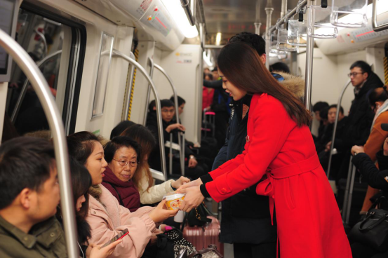 在黄河南路地铁站内,有乘客进入车厢后惊喜地发现,红衣天使正在派发清菲菲红枣湘莲银耳汤。“今日腊八,请您喝碗不一样的腊八粥”,红衣天使一边派发一边说:“8868体育官网登录入口清菲菲祝您腊八快乐!”